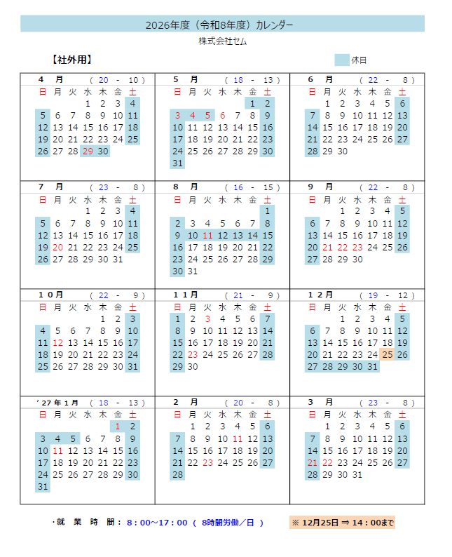 2026年度 弊社 稼働カレンダー確定